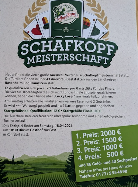 Gespielt wird mit der kurzen Karte. Solo, Wenz, Rufspiel. Plus-Minus. Startgebühren werden vollständig als Geldpreise ausgeschüttet. Brotzeit ab 13:30 Uhr verfügbar.