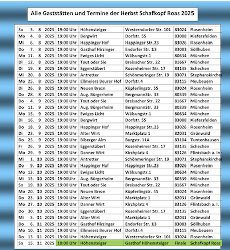 Wir gratulieren allen Ticketgewinnern*innen recht Herzlich und freuen uns auf einen schönen Schafkopftag. Ein Direkt Einkauf ins Finale der Schafkopf Roas ist möglich. Also können Ticket Gewinner auch gerne jemanden mitbringen. Wir starten um 10:00 Uhr seit bitte rechtzeitig da. Wir Spielen 3 Runden a 32 Spieler mit Tischwechsel. Essenspause findet nach der 2ten Runde statt. Ticket wert 80,00€ im Ticket enthalten ist das Mittagessen im Wert von 20,00€ (des iss was gscheids!!!) enthalten. Tickets sind bis zum Start des Turnieres Übertragbar!! Nach Start des Turnieres verfallen alle nicht eingelösten Tickets. Nicht eingelöste Tickets werden nicht erstattet! 017644224380 langes Blatt, mit Solo, Wenz und Farbwenz Plus Minus Punkte