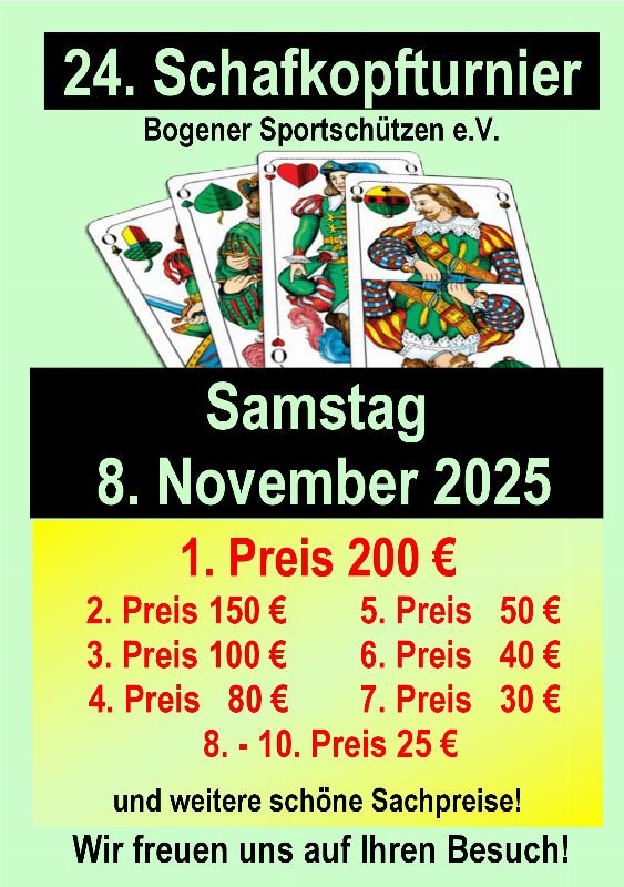 Zur Beginn der närrischen 5. Jahreszeit spielen wir ein närrisches Turnier. Wir Spielen alles, was es gibt. Von Solo über Geier bis hin zum Ramsch. Preise werden nach Anzahl der Teilnehmer ausgeschüttet