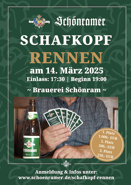 Schafkopf-Fans aufgepasst! Wir wollen das bayerische Kartenspiel wieder aufleben lassen und veranstalten ein großes Schönramer Schafkopfrennen bei uns in der Brauerei Schönram. Neben dem Hauptpreis von 1.000 € für den Sieger gibt es viele weitere attraktive Geld- und Sachpreise. Wir freuen uns auf zahlreiche Teilnehmer.