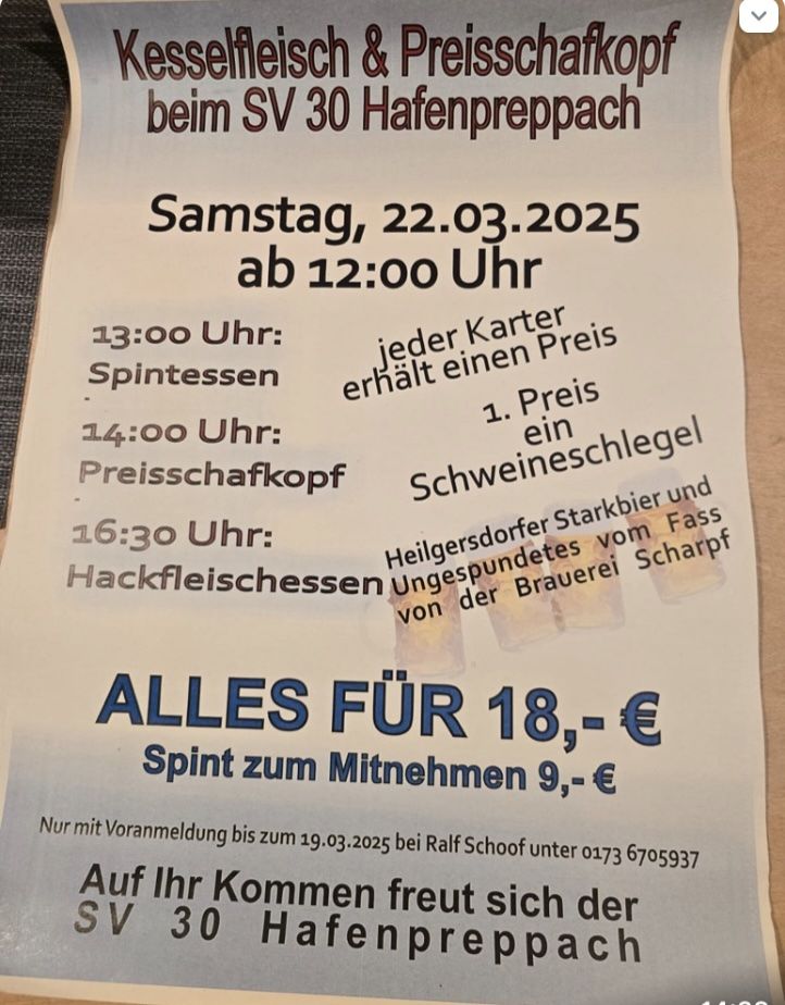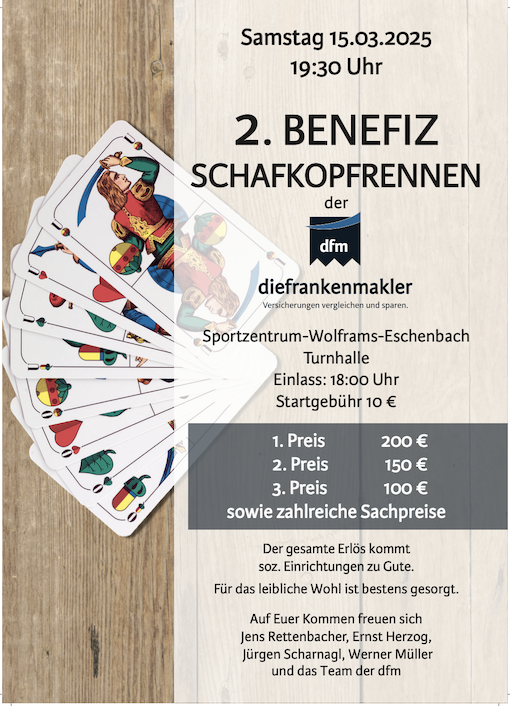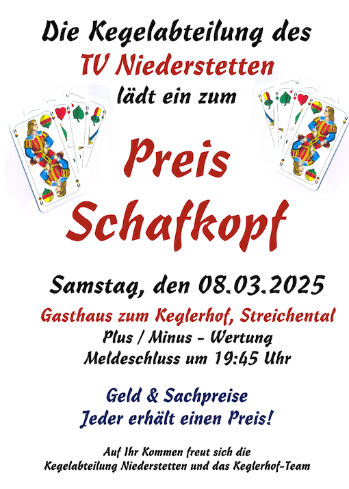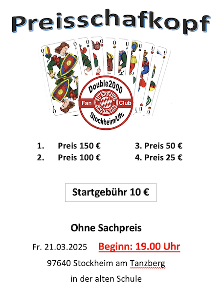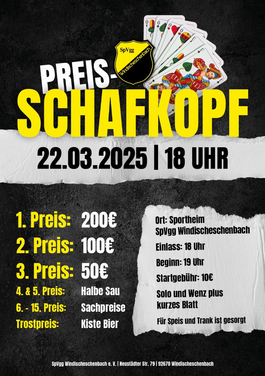 Der SV Poppenreuth veranstaltet am 9. März 2025 einen Preisschafkopf. Gespielt wird in 3 Runden ab 10.00 Uhr, 13.00 Uhr und 15.00 Uhr. Gespielt wird mit kurzem Blatt mit Solo und Wenz.