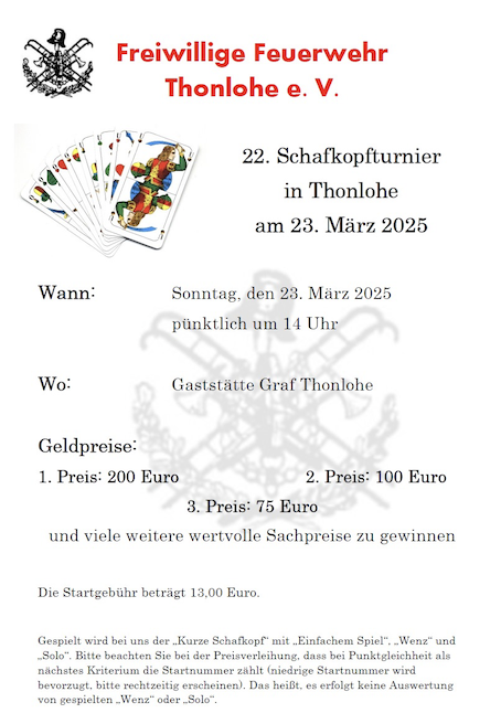 Gespielt wird kurzes Blatt. Jeder im Pluskonto erhält einen Essensgutschein im Wert von 25,00 €. Zusätzlich Geldpreise für den 1., 2. und 3. Platz.Â