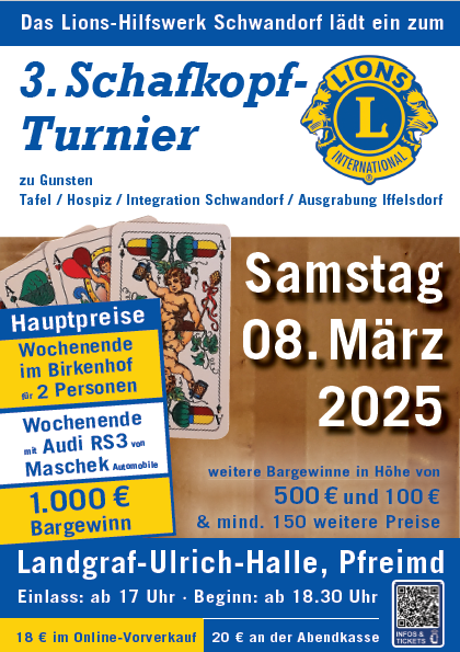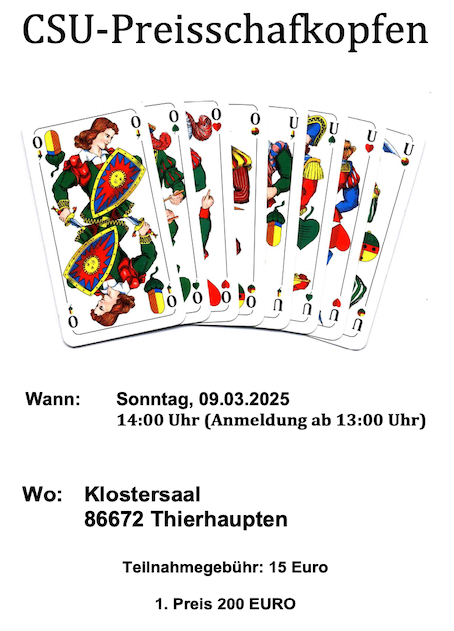 Geldpreise, Sachpreise (z. b. 1/2 Reh, Lammfell gegerbt, Räucherschinken), pro Partie ein Preis, Startgeld wird komplett ausbezahlt // Plus-Minus, Solo/Wenz, kurze Karte // Anmeldung erwünscht: 0157/51996321 (WhatsApp) o. 08461/1703 (Anrufbeantworter), KURZENTSCHLOSSENE sind immer willkommen!